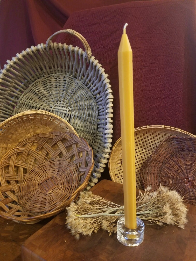 Our pencil tip taper candle is hand-poured with care using only pure, natural beeswax. It has a subtle, sweet honey scent and casts a warm, bright golden glow when lit.