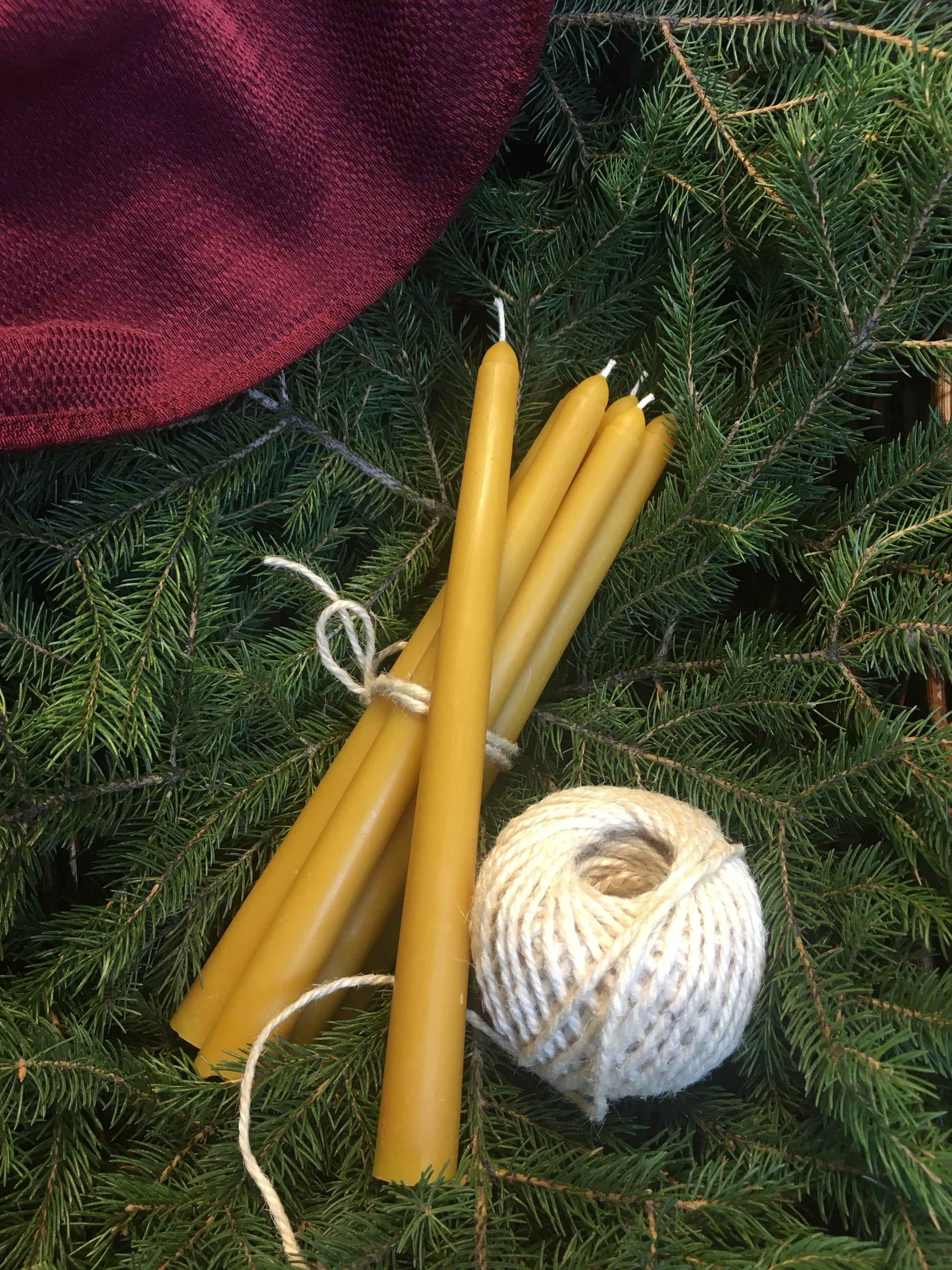 Our 11 inch taper candle is hand-poured with care using only pure, natural beeswax. It has a subtle, sweet honey scent and casts a warm, bright golden glow when lit.
