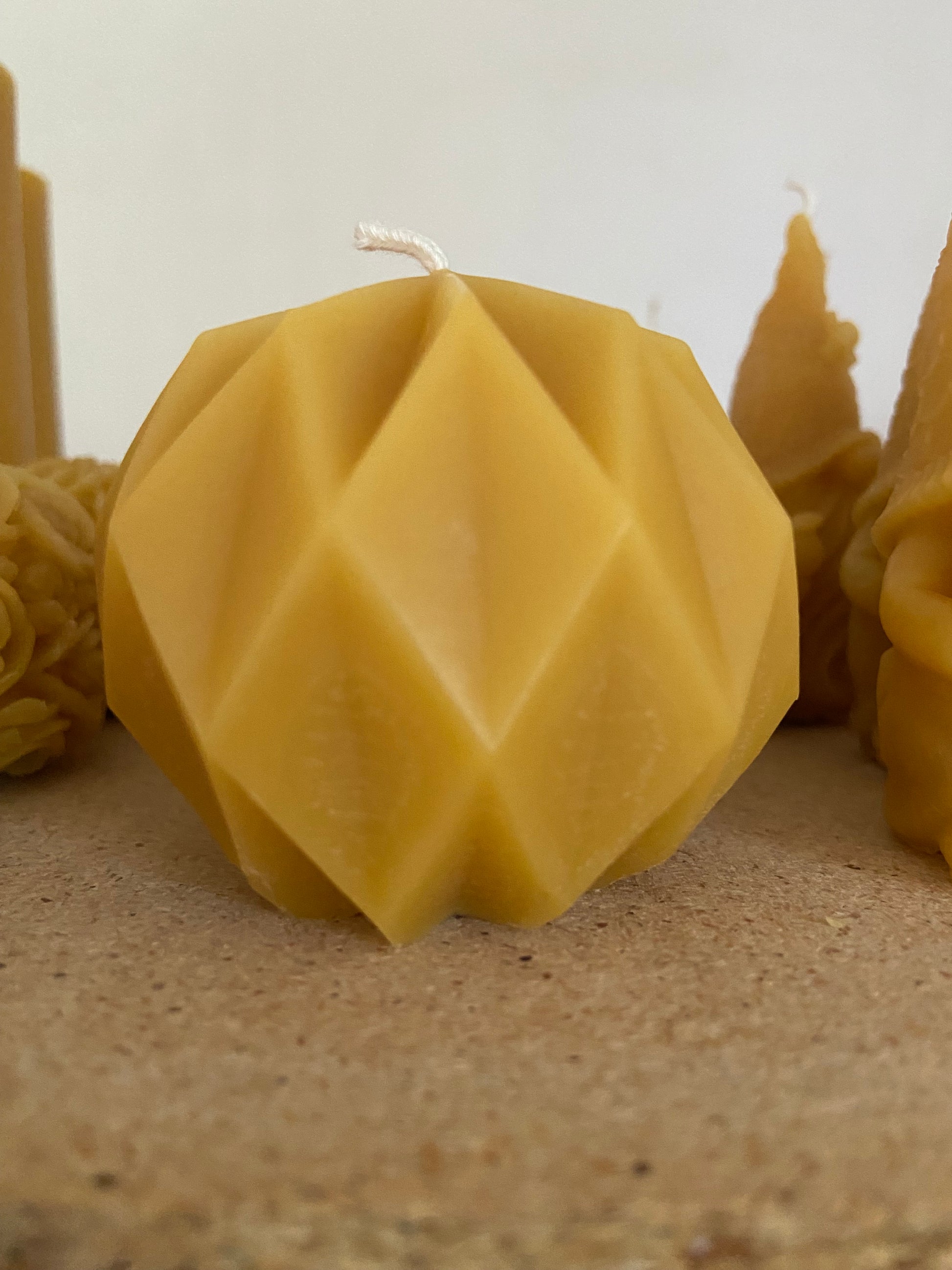 Our geometric diamond candle is hand-poured with care using only pure, natural beeswax. It has a subtle, sweet honey scent and casts a warm, bright golden glow when lit.